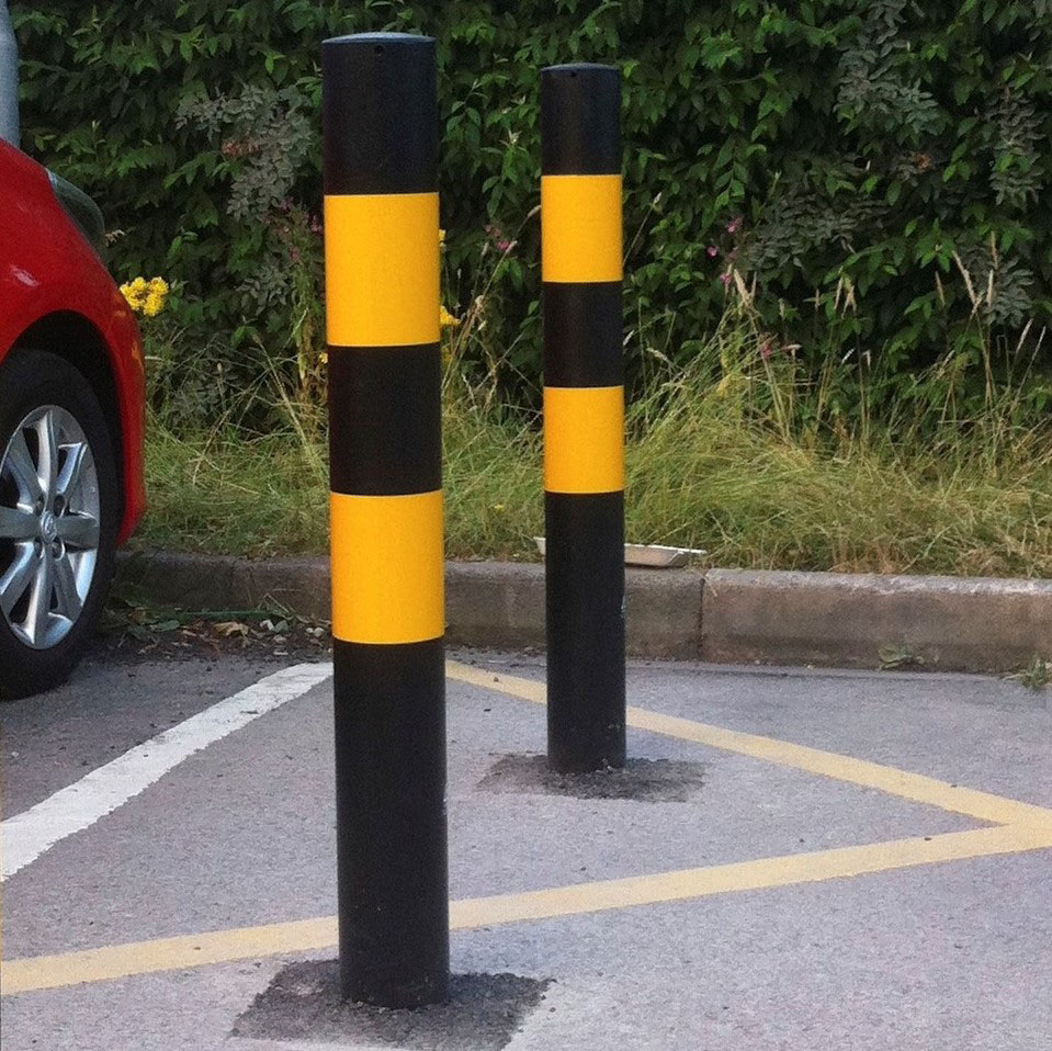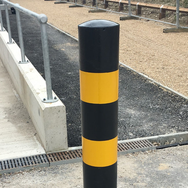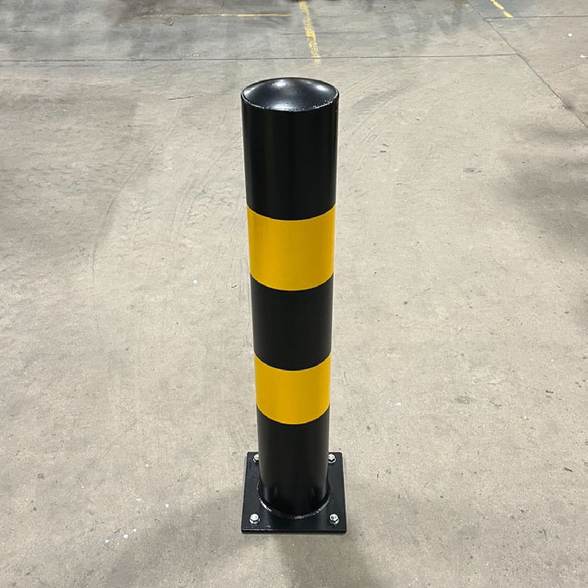 The bollard is coated black with 2 x 150mm reflective yellow bands spaced at 200mm.