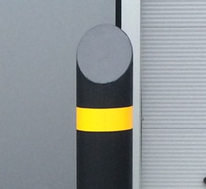 Mitre Top Bollards shown are coated black, complete with (an optional, available at extra cost) yellow reflective band. Other colours are available upon request (please state RAL number at time of order).