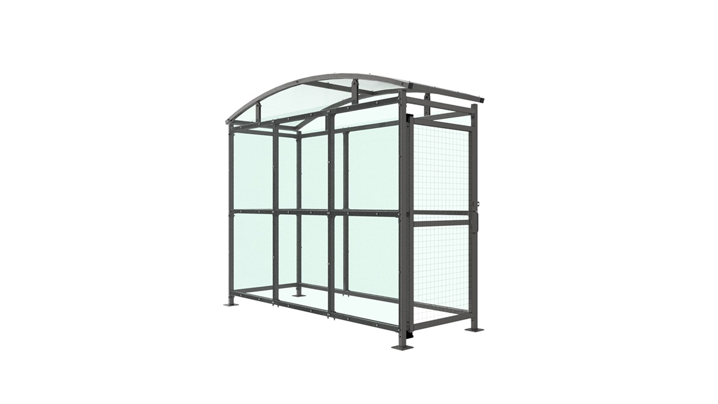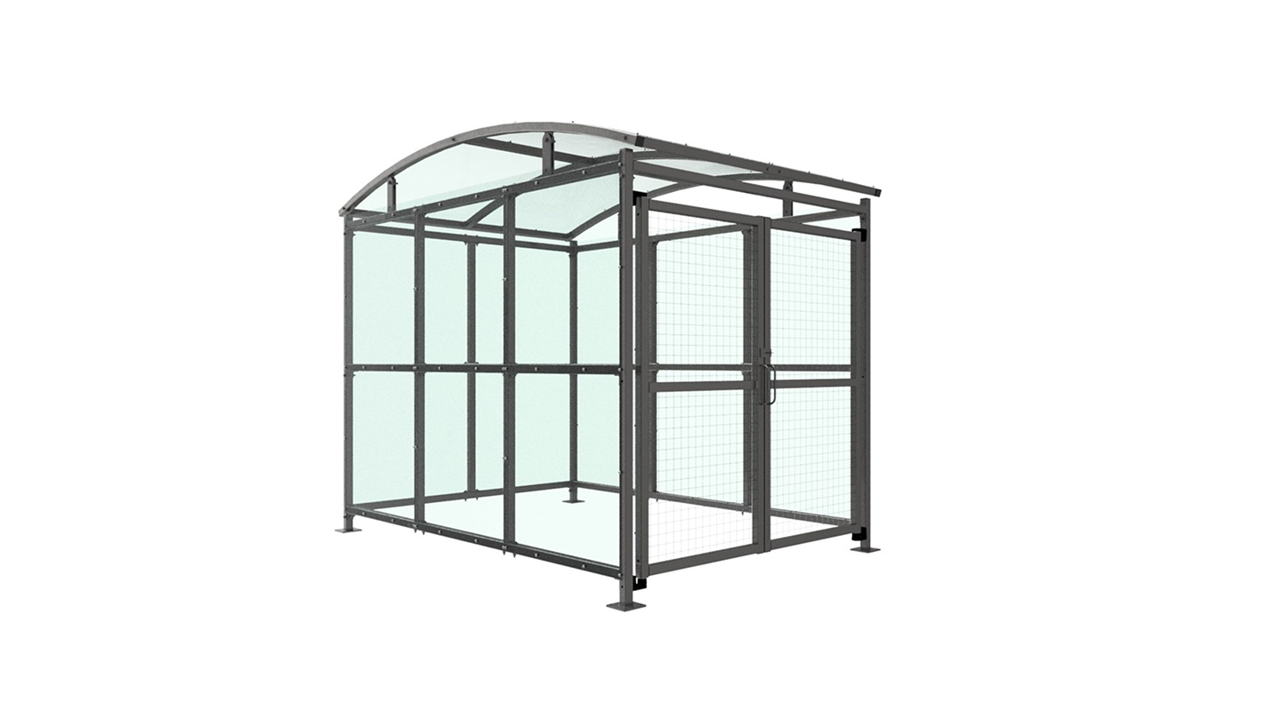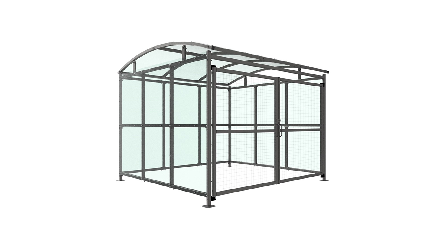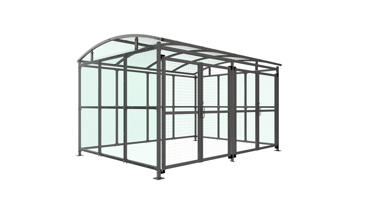 The DC1 variant of the Dodford shelter is a free-standing shelter with Mesh Doors lockable by padlock (not included) designed for on site assembly, constructed from galvanised mild steel. Complete with a 4mm PETG clear sheet curved roof and end panels.