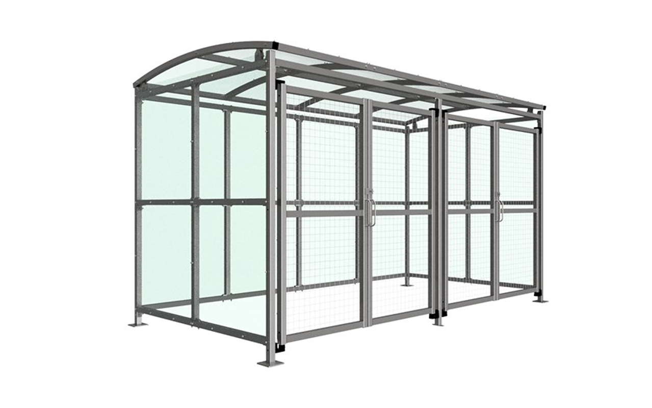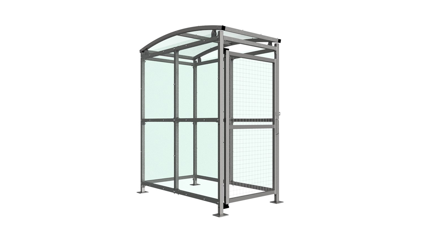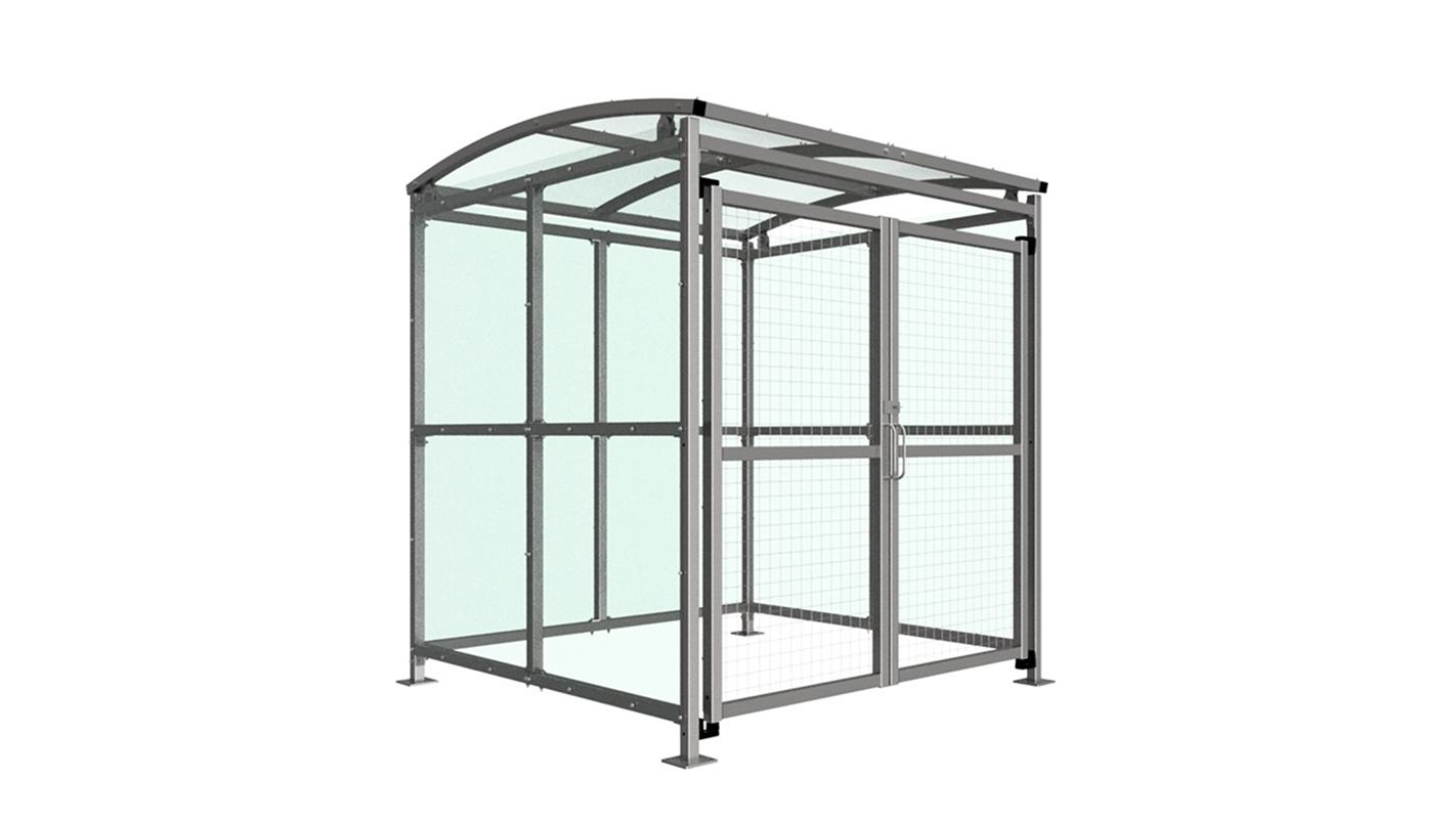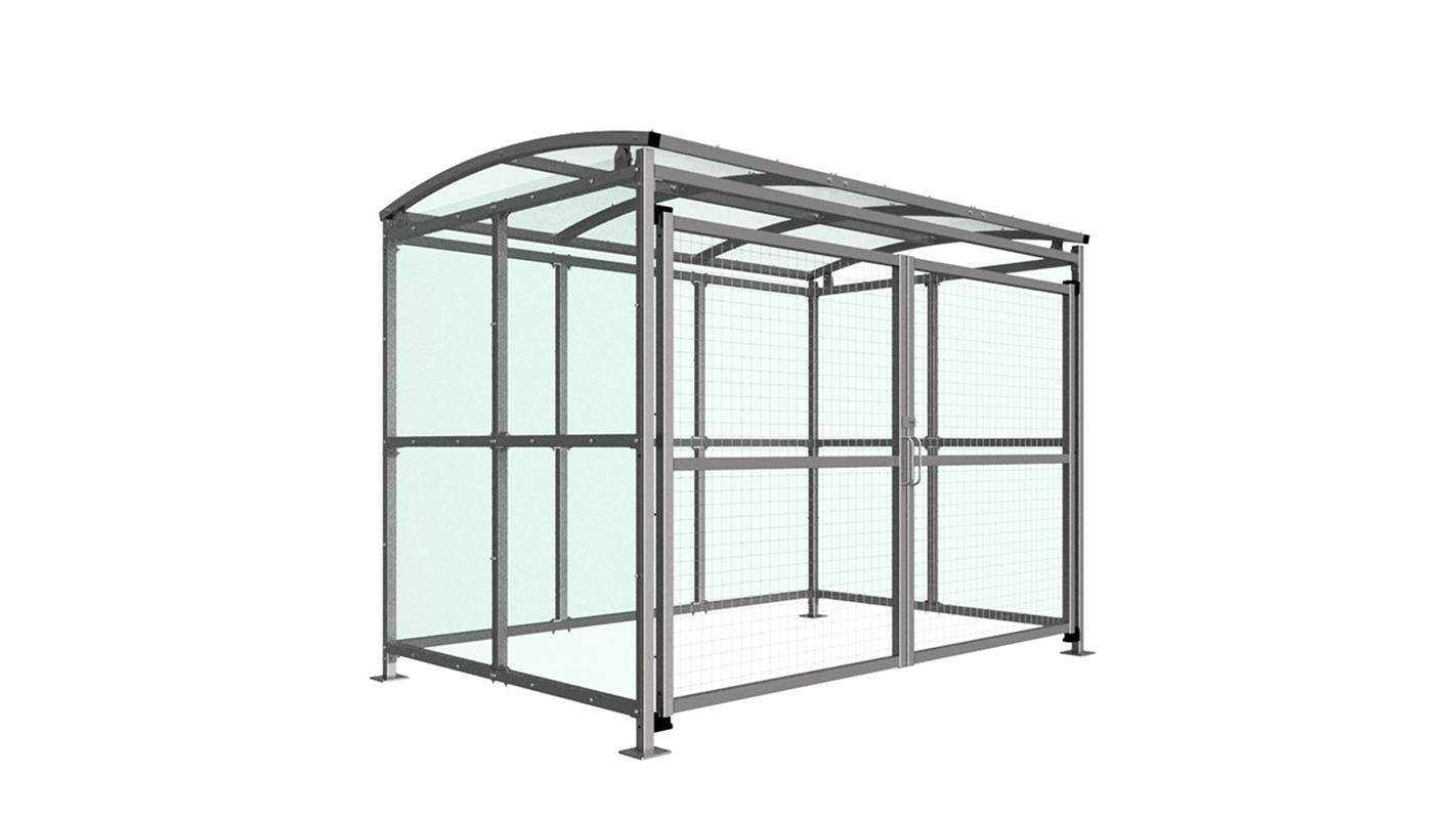 The MC1 variant of the Badby shelter is a free-standing shelter with Mesh Doors lockable by padlock (not included) designed for on site assembly, constructed from galvanised mild steel. Complete with a 4mm PETG clear sheet roof, and side panels. Front-to-back curved roof.