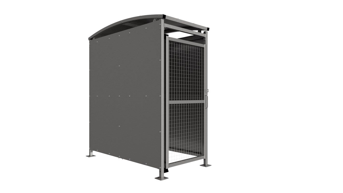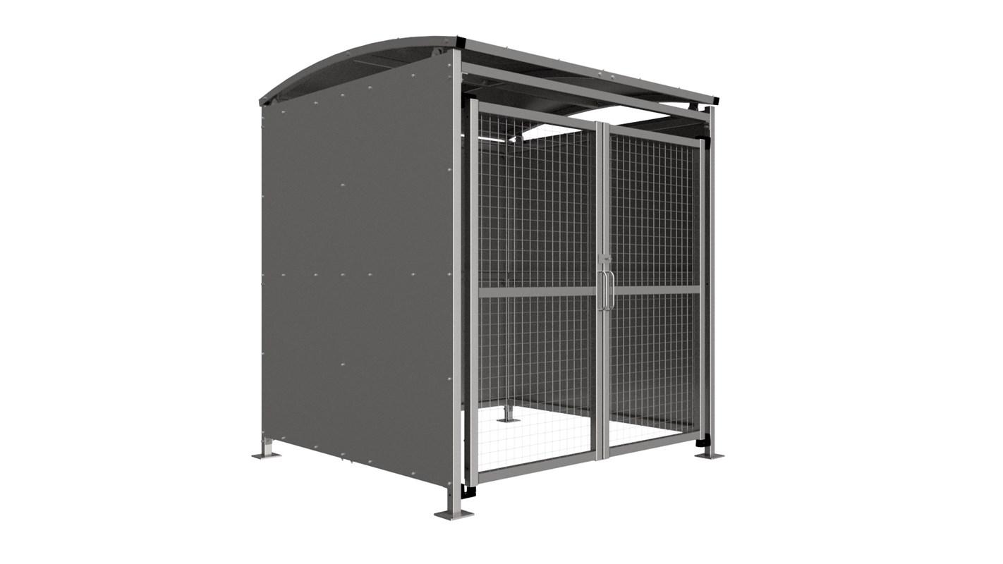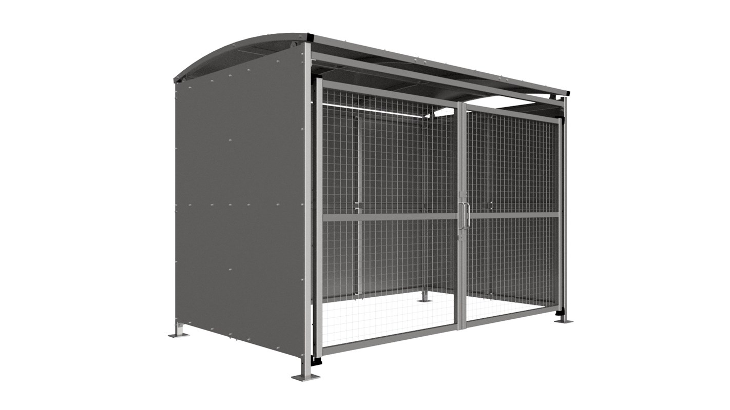 The MM1 variant of the Badby shelter is a free-standing shelter with Mesh Doors lockable by padlock (not included) designed for on site assembly, constructed from galvanised mild steel. Complete with Galvanised sheet roof, and side panels. Front-to-back curved roof.