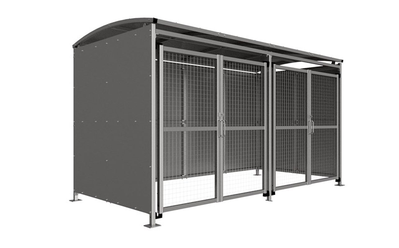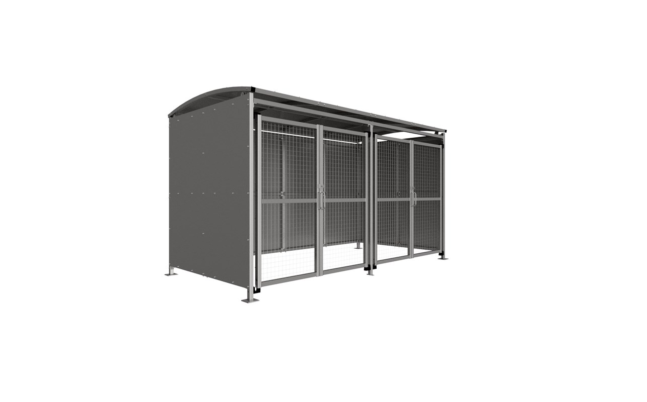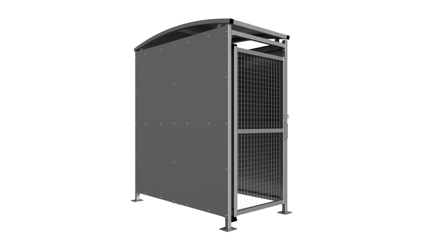The MM1 variant of the Badby shelter is a free-standing shelter with Mesh Doors lockable by padlock (not included) designed for on site assembly, constructed from galvanised mild steel. Complete with Galvanised sheet roof, and side panels. Front-to-back curved roof.