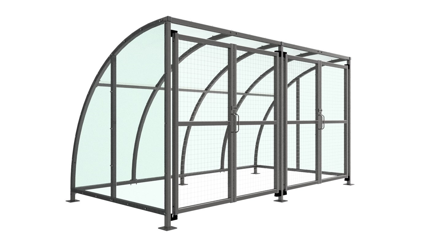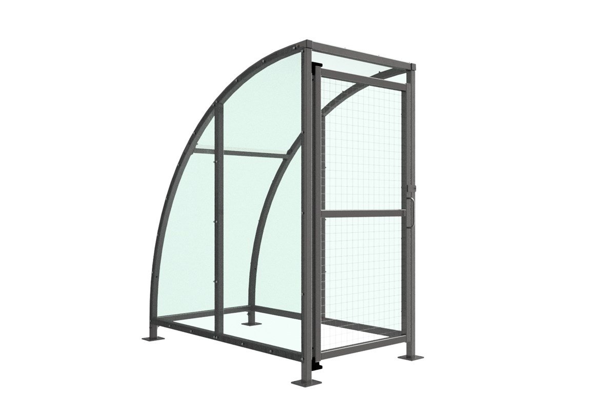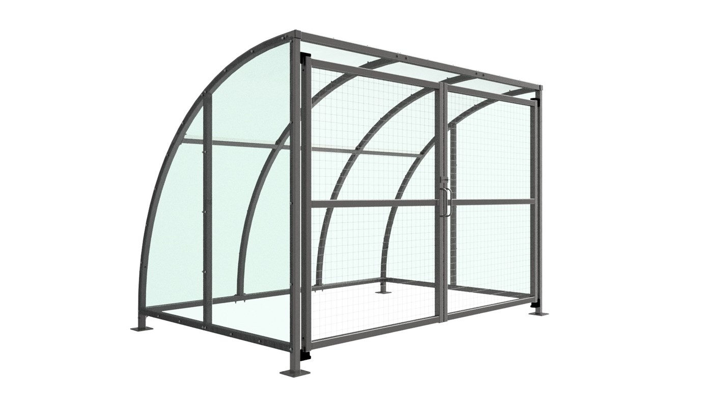 The SC1 variant of the Stratford shelter is a free-standing shelter with Mesh Doors lockable by padlock (not included) designed for on site assembly, constructed from galvanised mild steel. Complete with a 4mm PETG clear sheet curved roof and end panels.