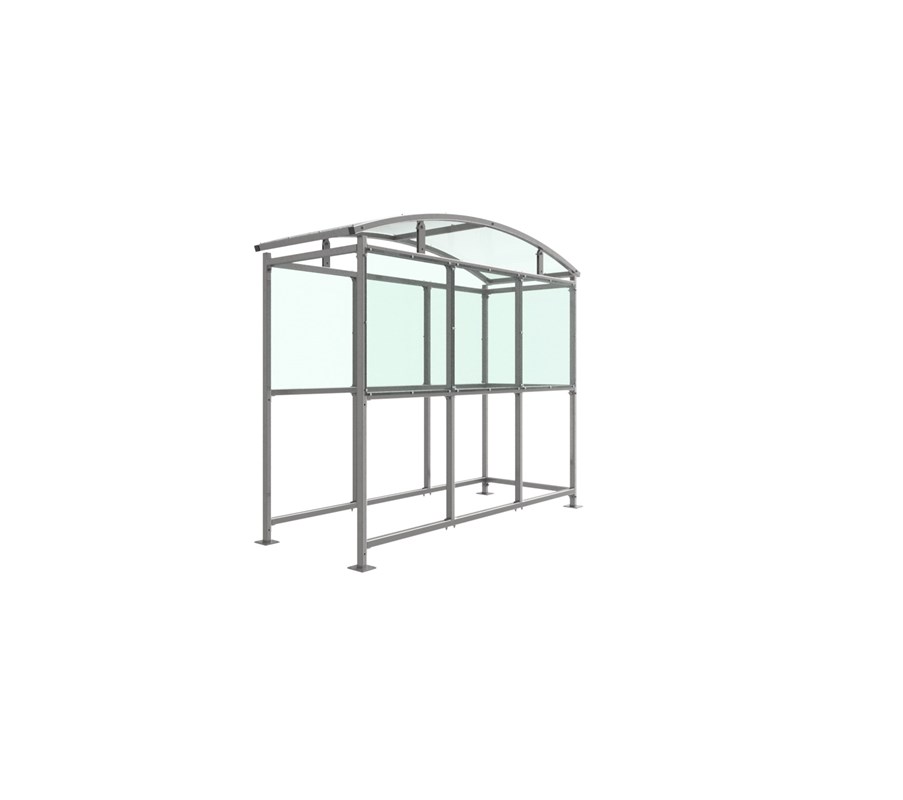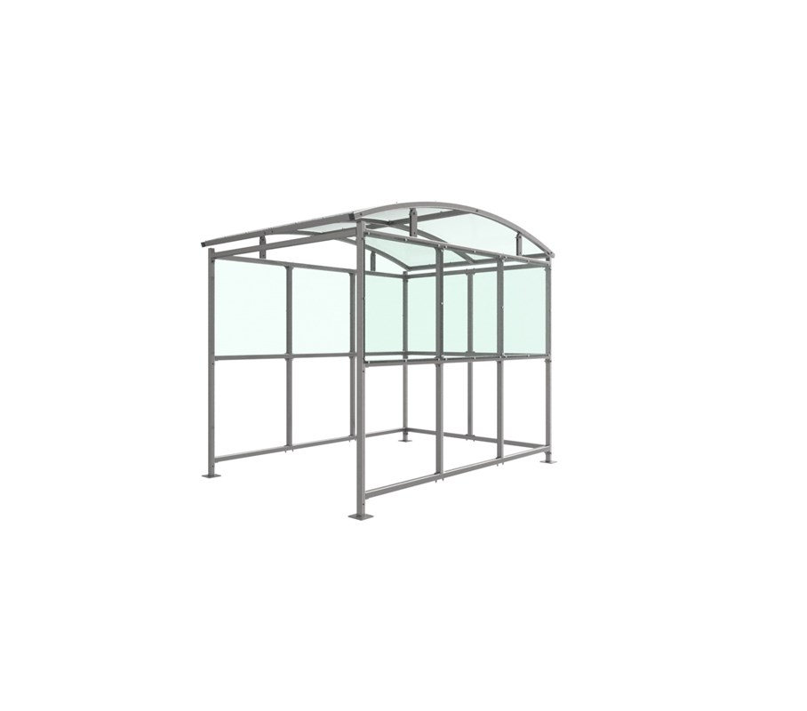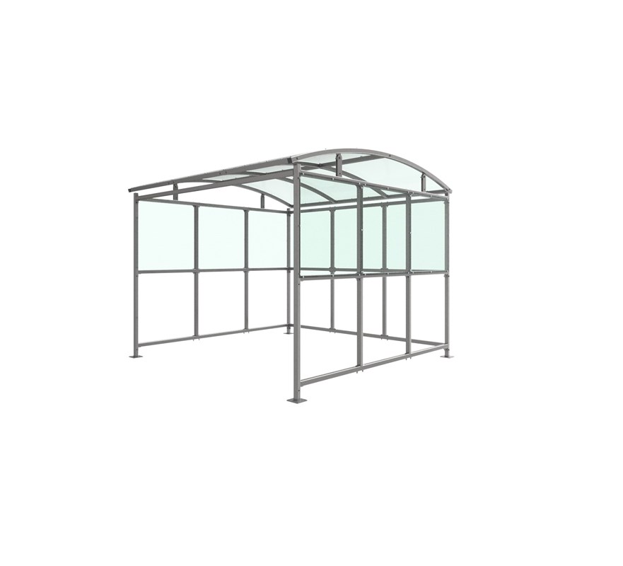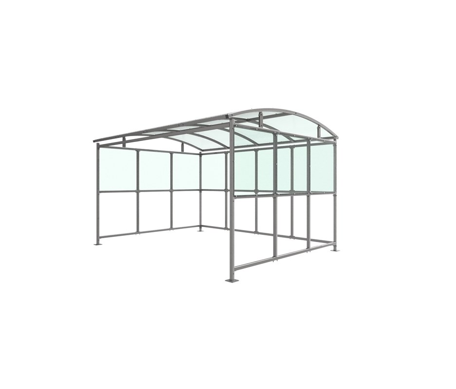 The Combe shelter is a free-standing, open sided shelter designed for on site assembly, constructed from galvanised mild steel. Complete with a 4mm PETG clear sheet roof, and ½ side panels. Front-to-back curved roof.