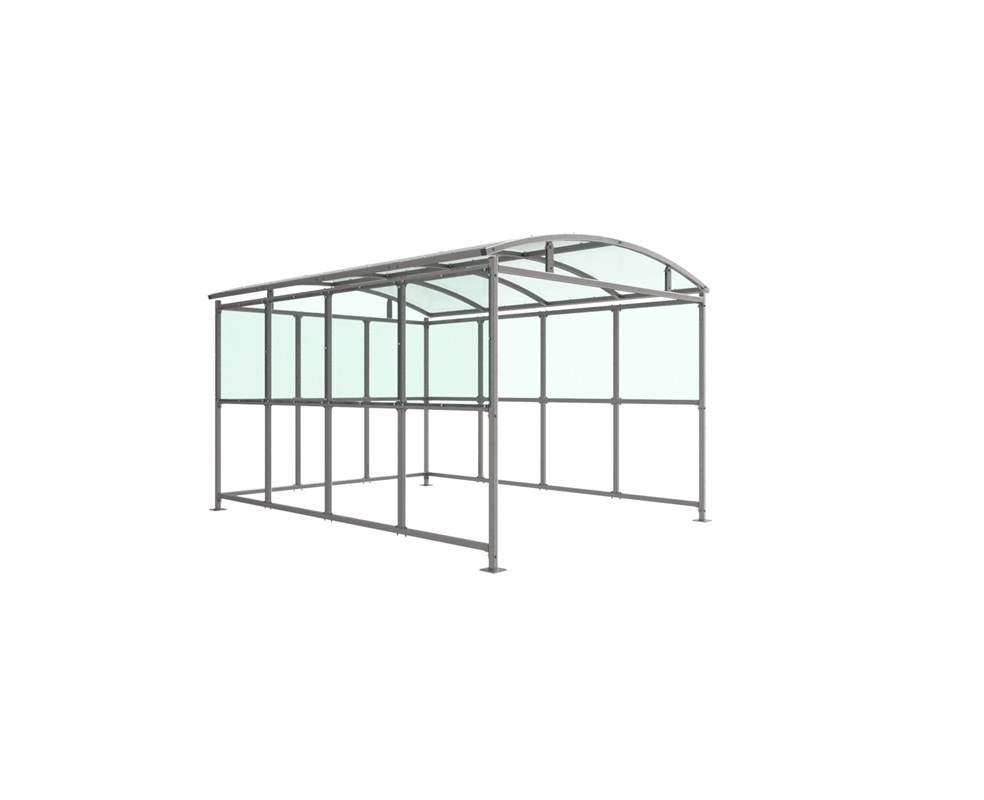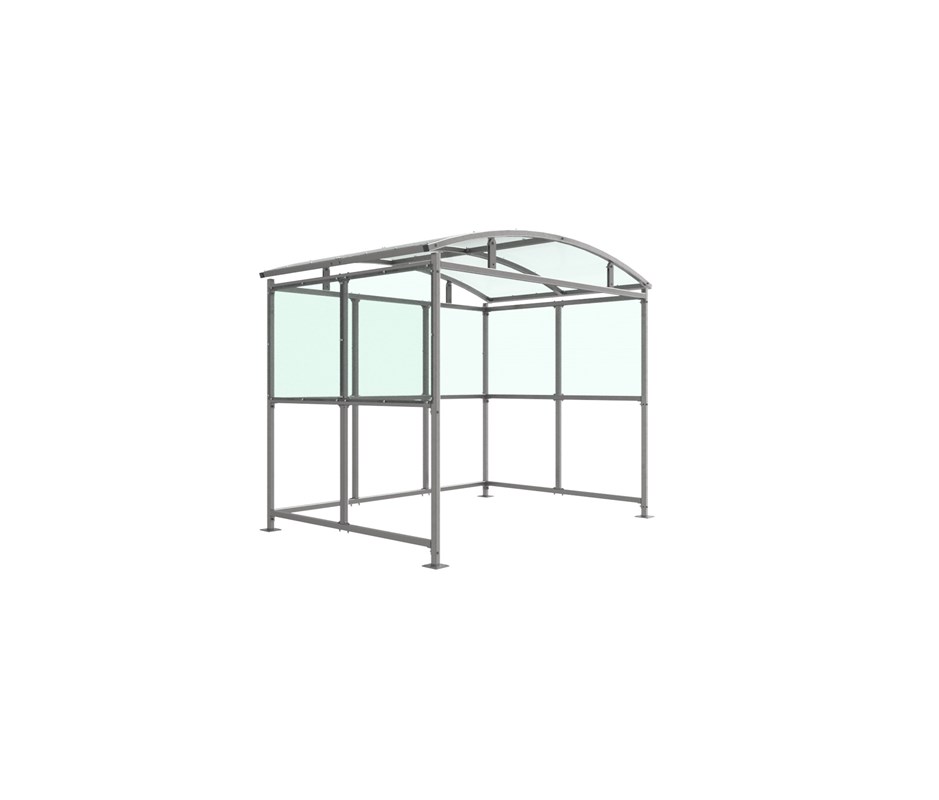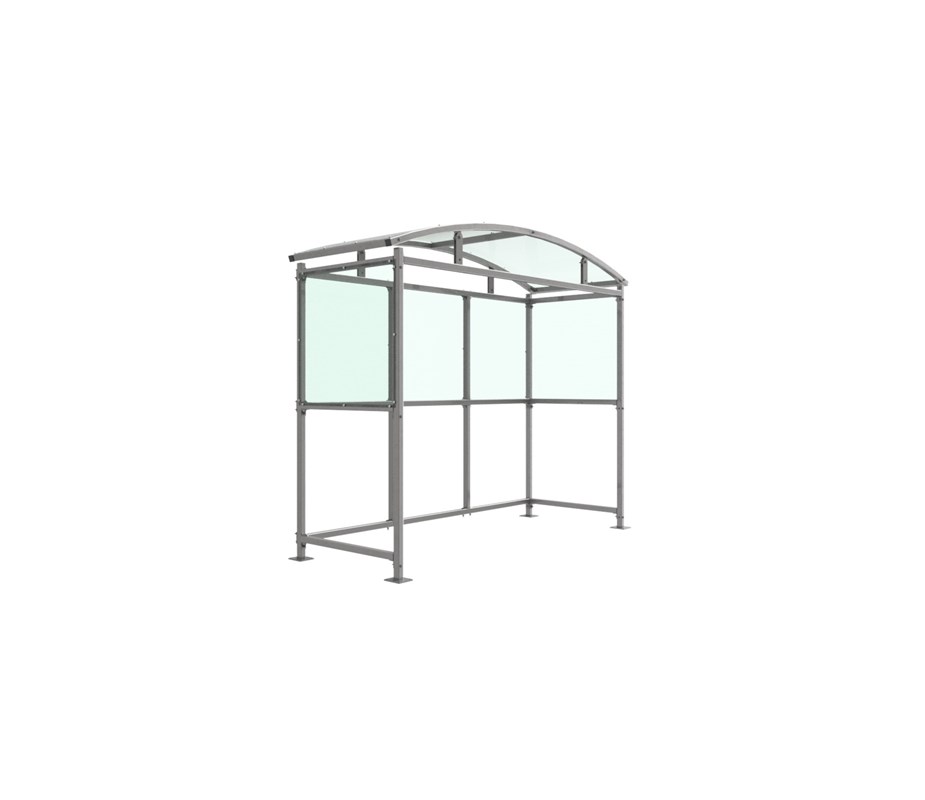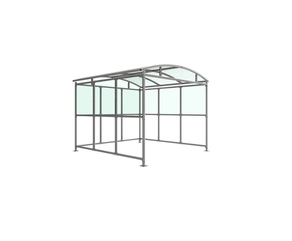 The Inglewood shelter is a free-standing, open fronted shelter designed for on site assembly, constructed from galvanised mild steel. Complete with a 4mm PETG clear sheet roof, and ½ side panels. Side-to side curved roof.