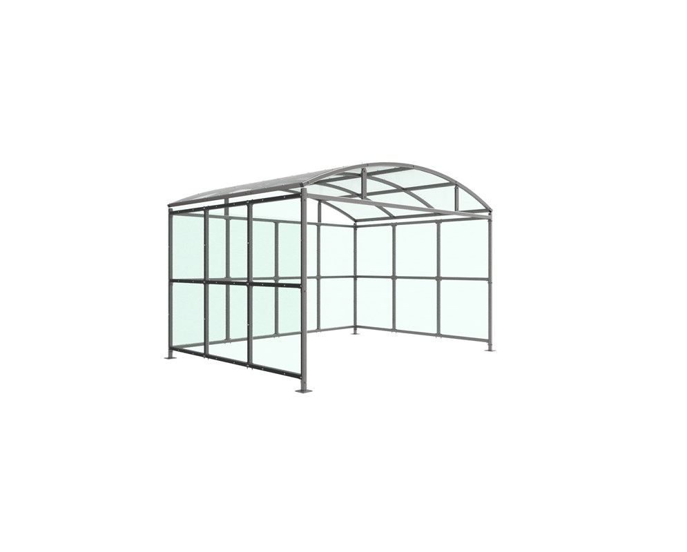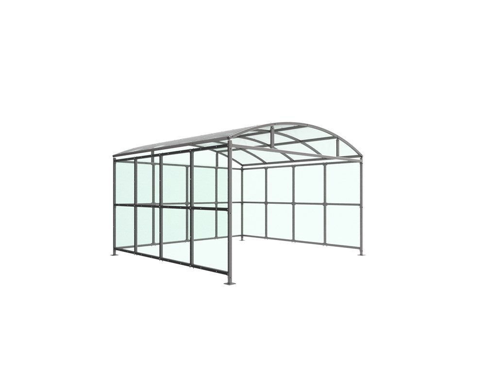 The Welton shelter is a free-standing, open fronted shelter designed for on site assembly, constructed from galvanised mild steel. Complete with a 4mm PETG clear sheet roof, and side panels. Side-to side curved roof. Width of 4m, with lengths from 1m-5m, extension bays can be added to achieve the desired shelter length. Bolt down as standard.